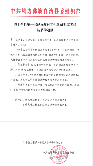 近日,經(jīng)峨邊彝族自治縣委組織部考核,我公司駐新林鎮(zhèn)楠林村第一書記代廣超、駐沙坪鎮(zhèn)河溝村隊(duì)員王德波兩名同志獲期滿考核“優(yōu)秀”等次。