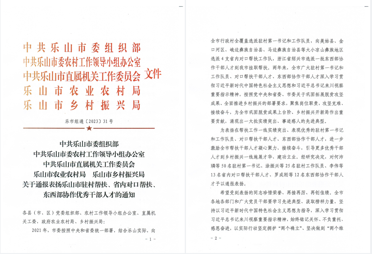 根據(jù)(樂市組通【2023】31號)文件精神,中共樂山市委組織部、中共樂山市委農(nóng)村工作領(lǐng)導(dǎo)小組辦公室等6單位發(fā)文對全市50名駐村第一書記、25名駐村工作隊員、13名省內(nèi)對口幫扶干部人才、12名東西部協(xié)作干部人才進(jìn)行通報表揚,我公司駐峨邊縣沙坪鎮(zhèn)河溝村工作隊員王德波同志榜上有名、被予表揚。