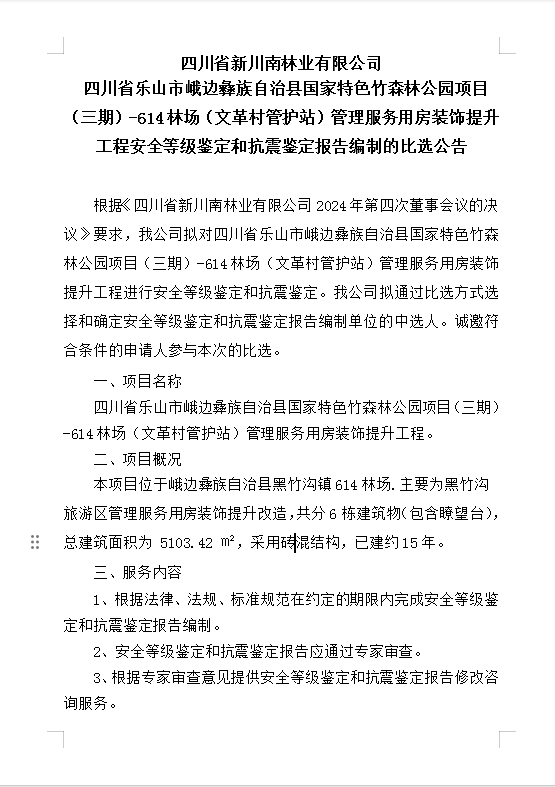 四川省新川南林業(yè)有限公司614林場(chǎng)(文革村管護(hù)站)管理服務(wù)用房裝飾提升工程安全等級(jí)鑒定和抗震鑒定報(bào)告編制的比選公告