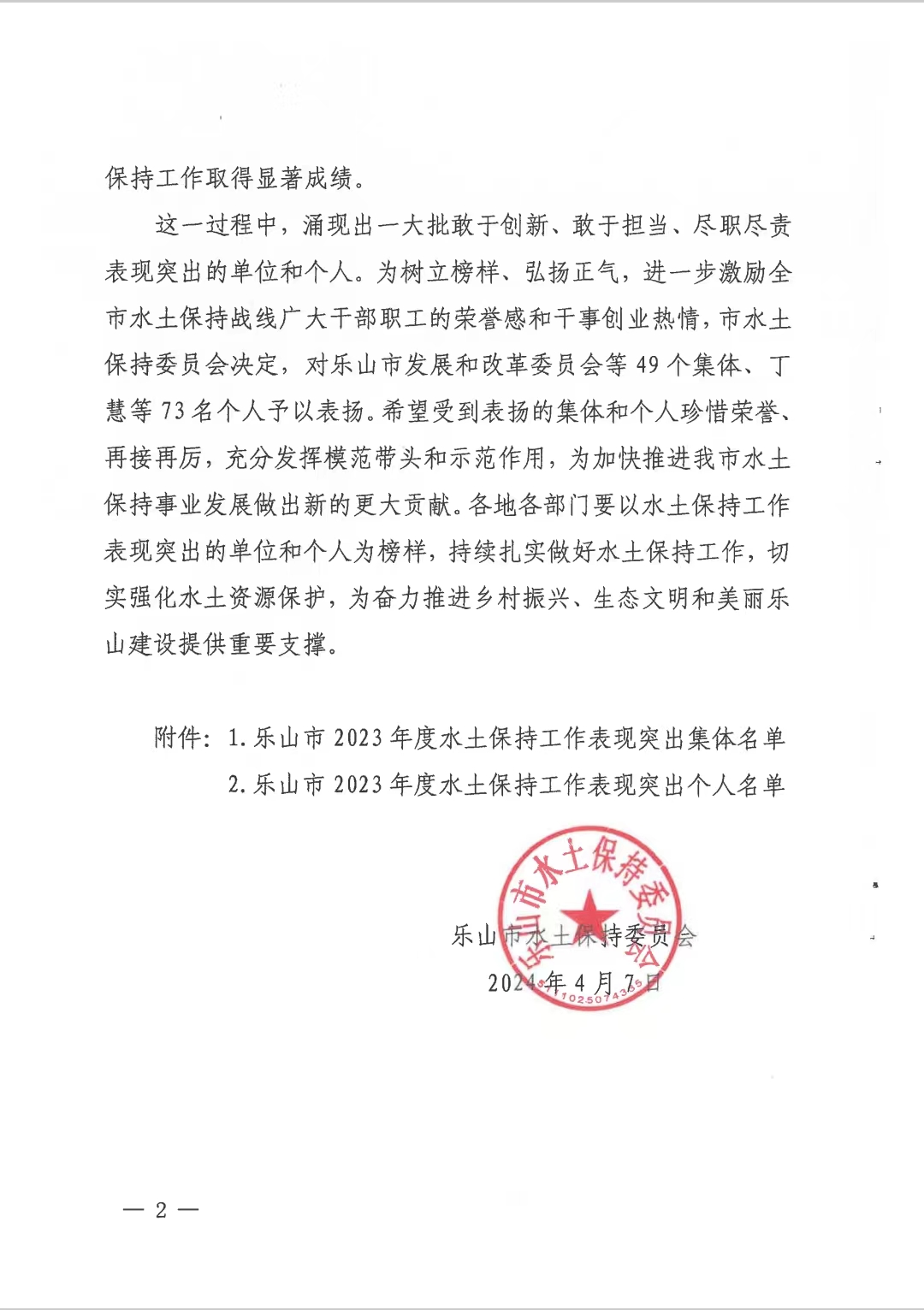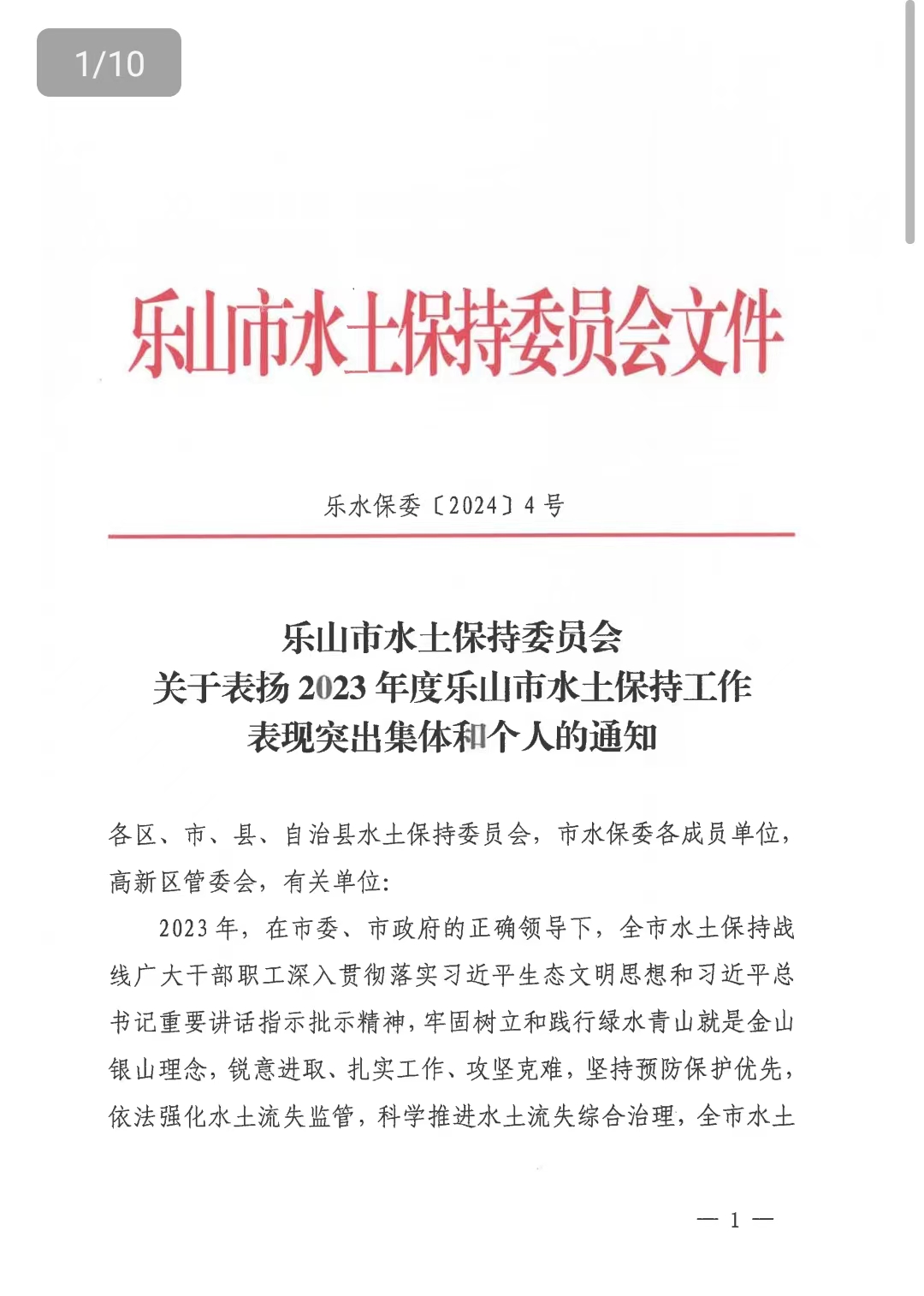 根據(jù)(樂水保委【2024】4號)文件,樂山市水土保持委員會對全市2023年水土保持工作中表現(xiàn)突出的49個集體、73名個人發(fā)文予以表揚,公司天保辦李時黑布同志榜上有名,喜獲“樂山市2023年度水土保持工作表現(xiàn)突出個人”稱號。